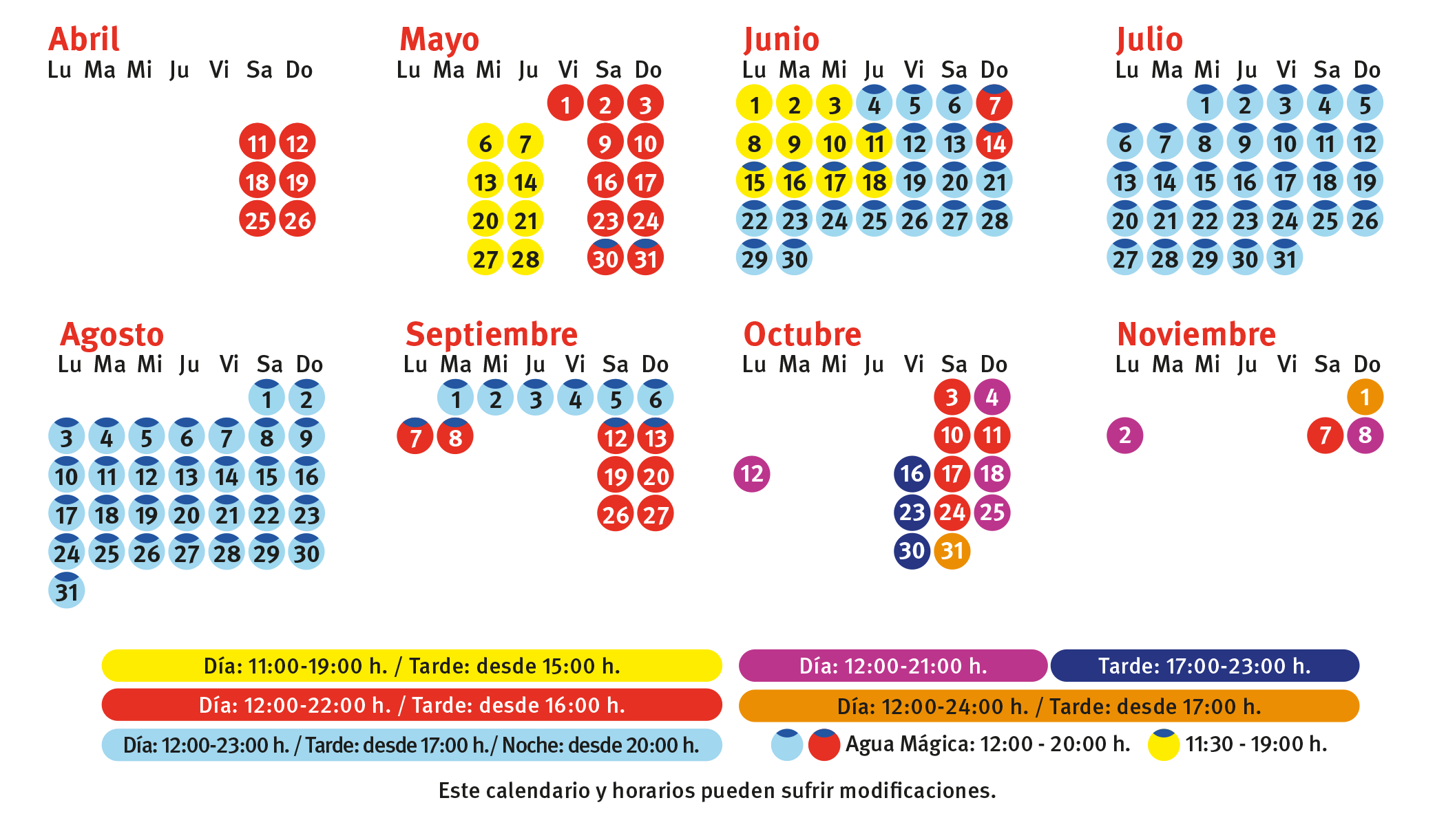 Los horarios de apertura y cierre del parque y de las atracciones, restaurantes, juegos y otros recintos pueden sufrir modificaciones por motivos técnicos u operativos.