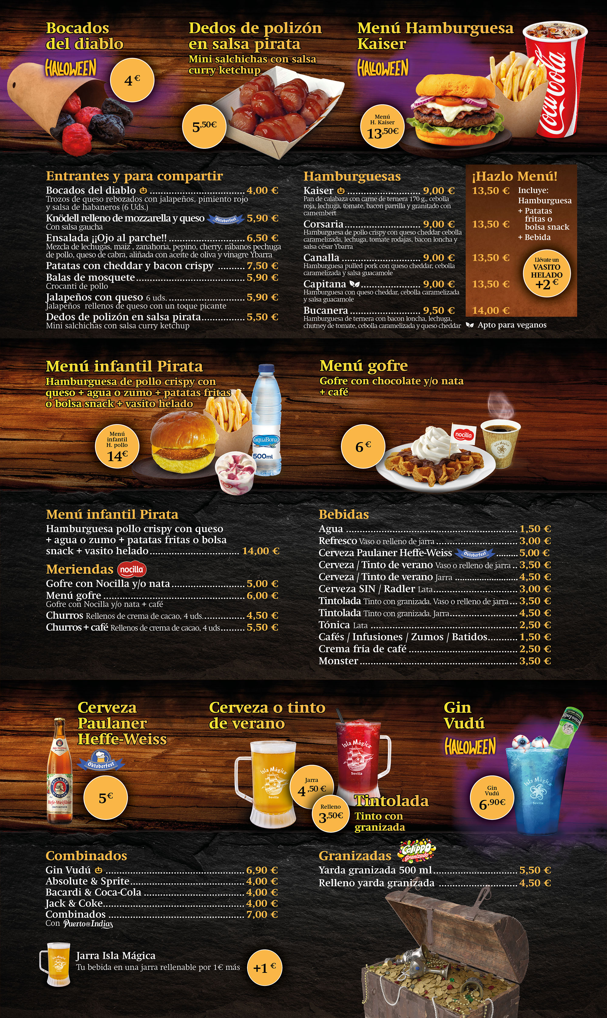 Durante o Halloween, aproveite os pratos e bebidas especiais da Oktoberfest. No resto da temporada, pizzas, waffles e pipocas para desfrutar durante os espectáculos no El Fuerte.